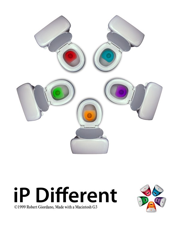 In 1999, the Apple iMac came in five colors. Robert Giordano created this parody by photographing toilets with transparency film, then assembling the individual shots in Photoshop on a 300 MHz Macintosh G3. The final image was a 24" x 36", 300dpi poster. Copyright 1999 Robert Giordano.![]()